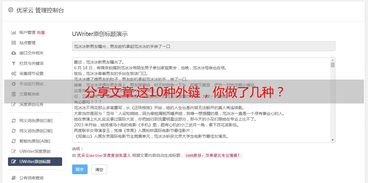 可以统一管理数十万个不同的cms网站。一个人维护数百个网站文章更新不是问题。插件内置伪原创功能,选择伪原创加上SEO优化功能,让网站更容易获得收录排名!