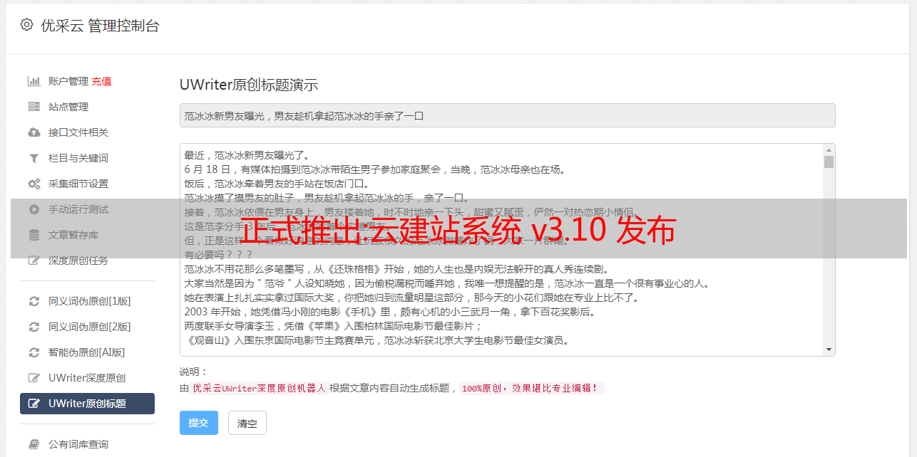 优采云 发布时间: 2022-11-18 05:22正式推出:云建站系统 v3.10 发布