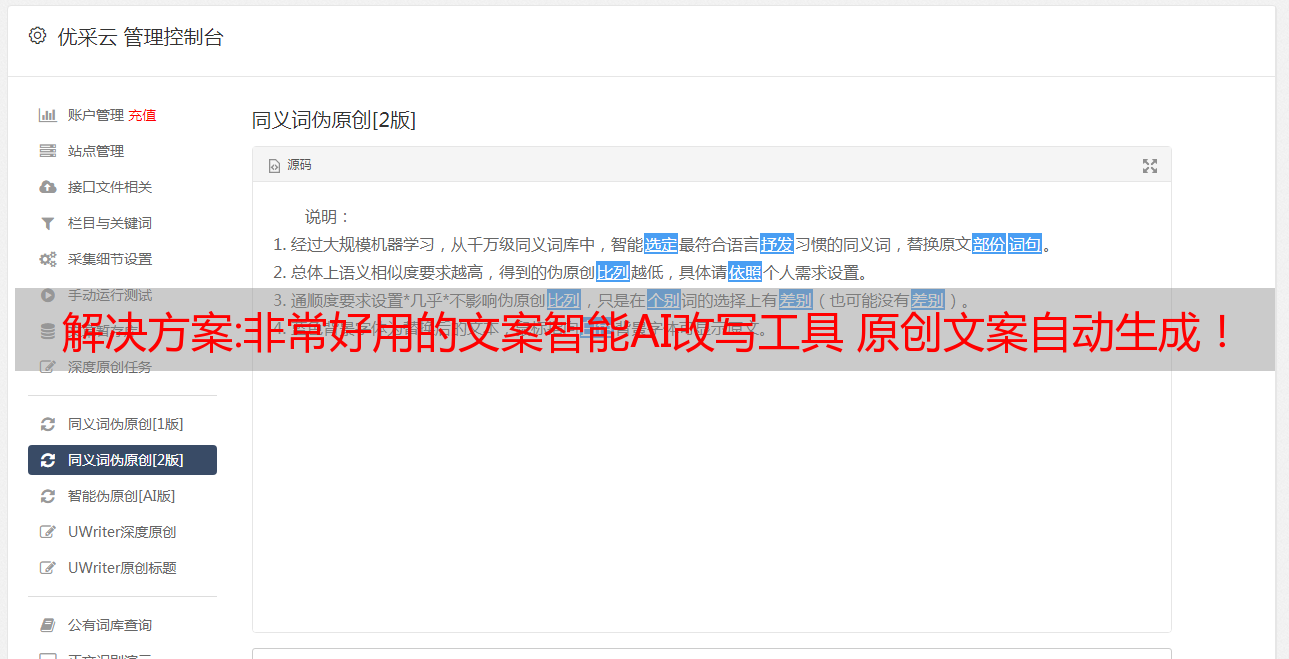 解决方案:非常好用的文案智能AI改写工具 原创文案自动生成!