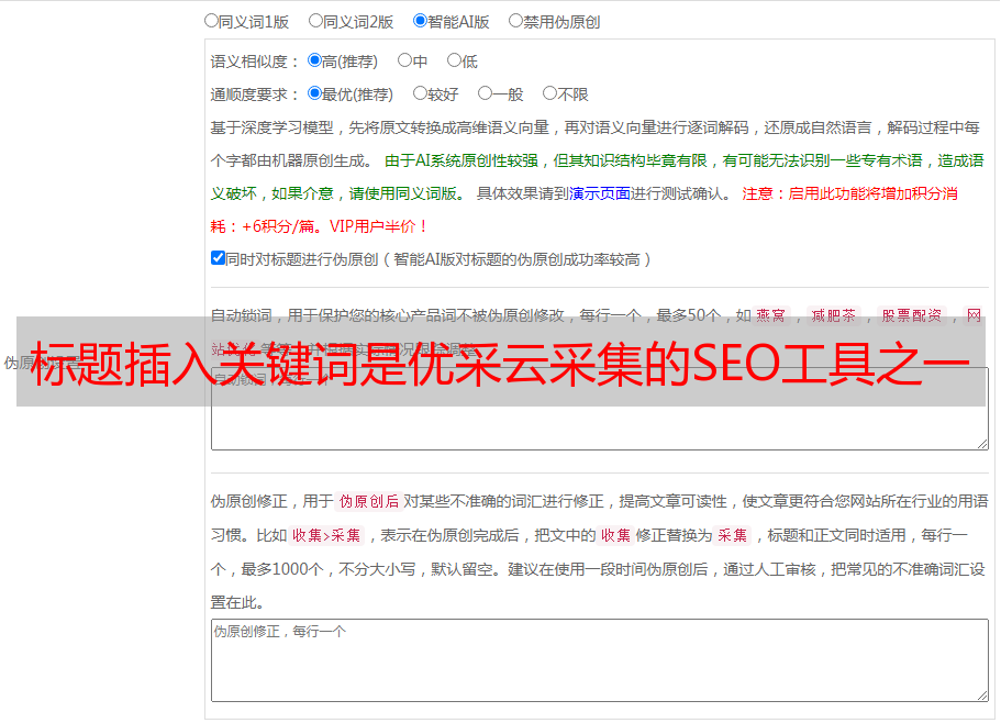 标题插入关键词:指在文章标题(默认标题字段)的开头或结尾随机插入用户提供的关键词,也可以选择是否对标题进行分段,用户提供的关键词(即关键词库)进行相交并插入相交结果。