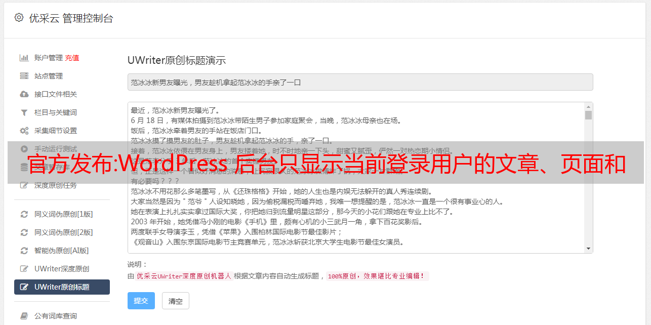 优采云 发布时间: 2022-12-08 16:58官方发布:WordPress 后台只显示当前登录用户的文章、页面和媒体