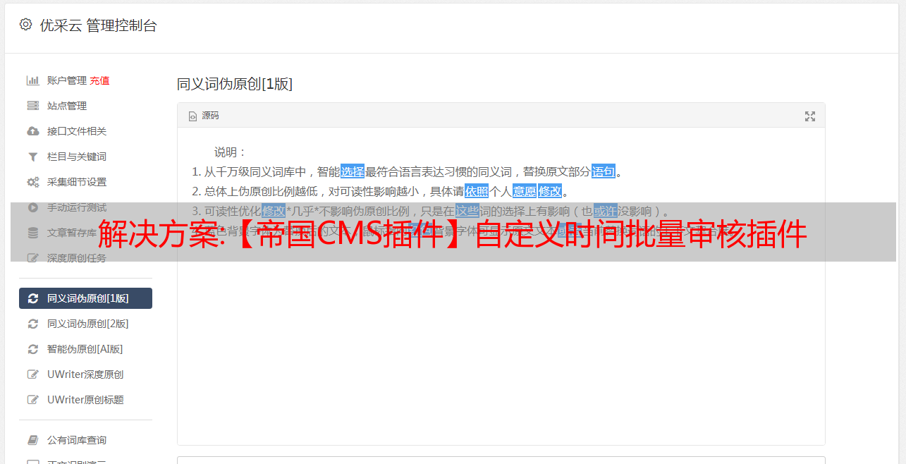 优采云 发布时间: 2022-12-11 18:40解决方案:【帝国CMS插件】自定义时间批量审核插件