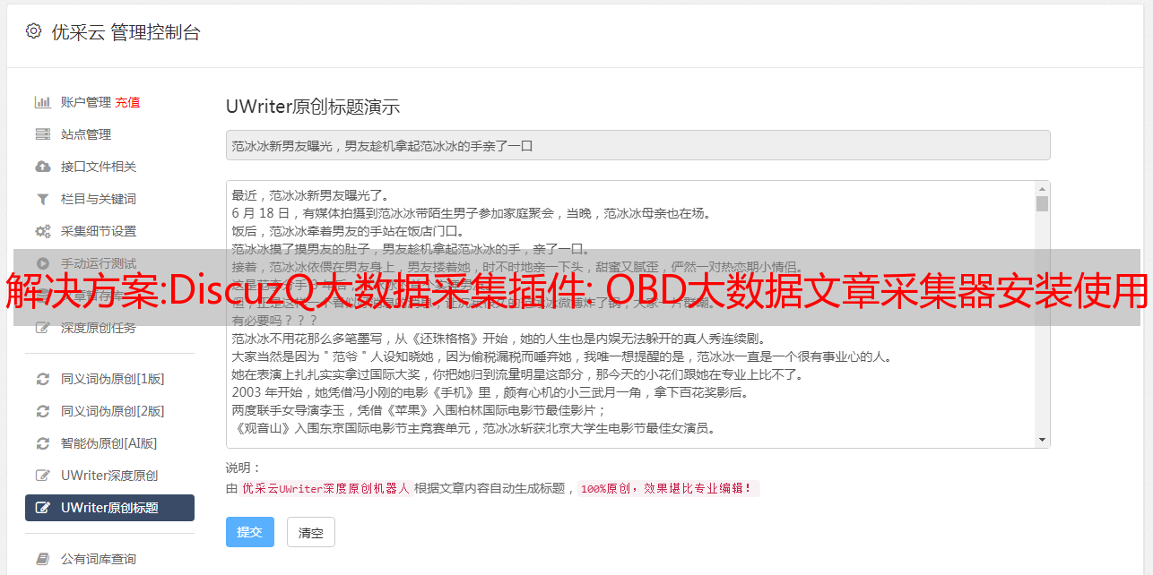 优采云 发布时间: 2022-12-16 00:51解决方案:DiscuzQ大数据采集插件: OBD大数据文章采集器安装使用教程 For Di