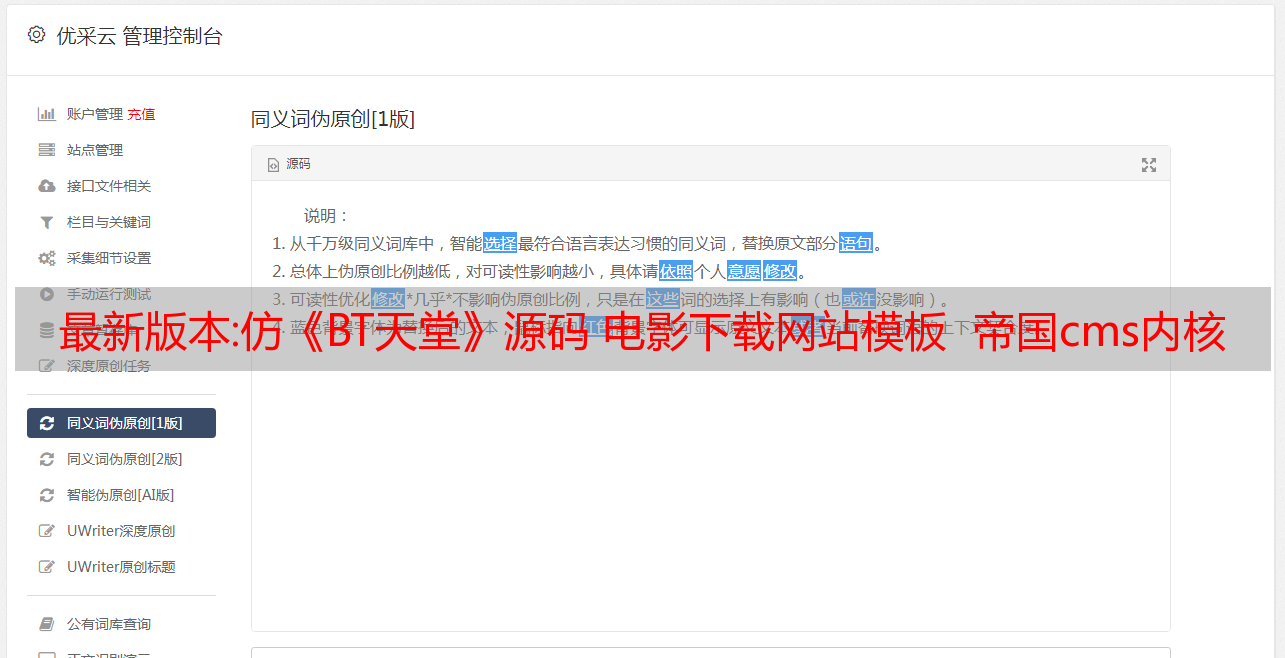优采云 发布时间: 2022-12-16 19:58最新版本:仿《BT天堂》源码 电影下载网站模板 帝国cms内核+优采云自动采集