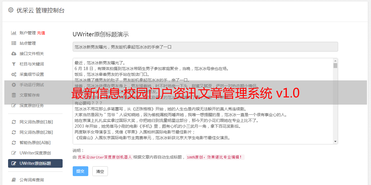 优采云 发布时间: 2022-12-17 07:11最新信息:校园门户资讯文章管理系统 v1.0