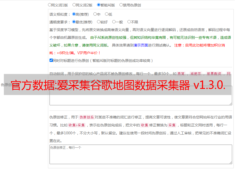 12、修复部分百度网页因系统原因无法跳转到网址而无法采集的问题; 添加自动去除网址#后缀部分,会导致网页读取错误; 采集文章网址添加左右插入选项; 修复部分旧版本导致的截取本体过滤问题; 其他更新。