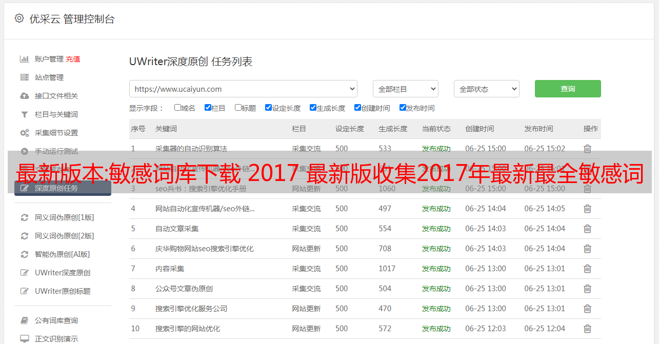 优采云 发布时间: 2022-12-22 13:22最新版本:敏感词库下载 2017 最新版收集2017年最新最全敏感词