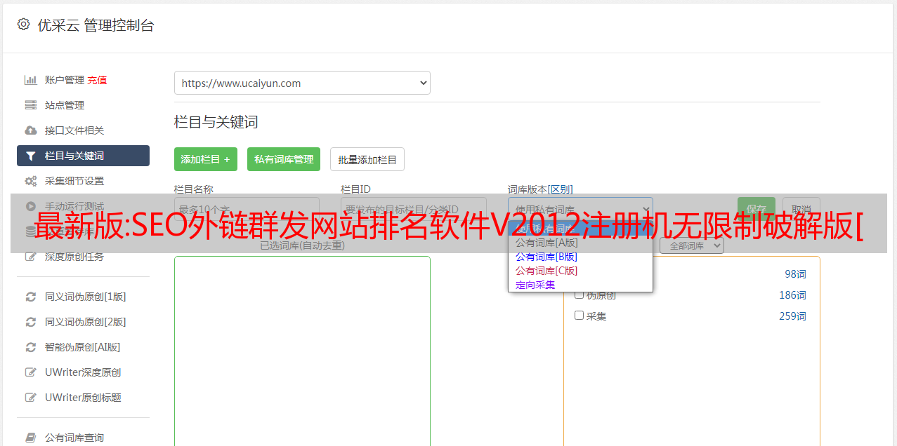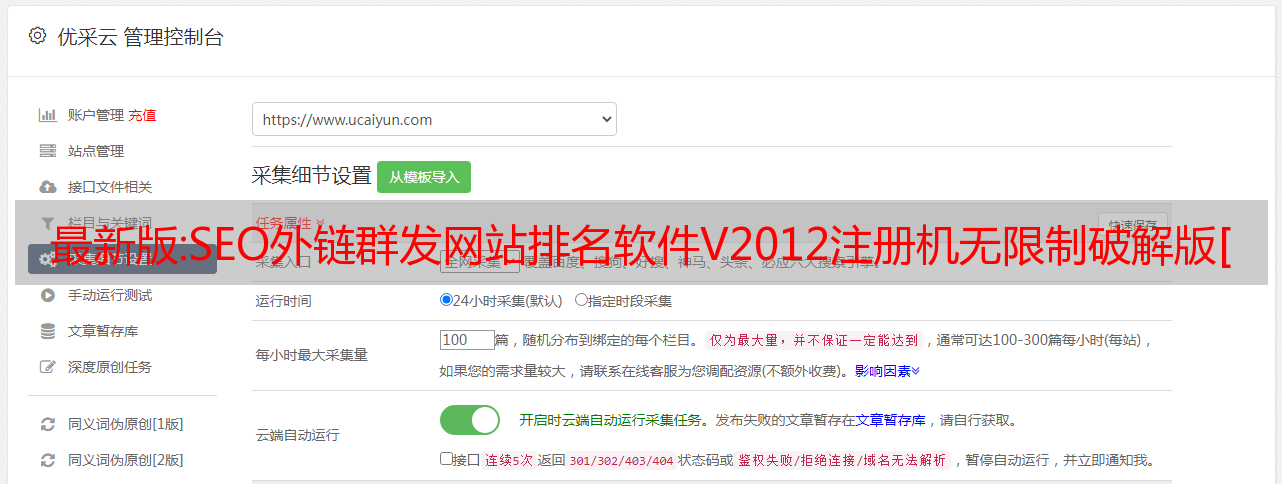 优采云 发布时间: 2022-12-23 01:45最新版:SEO外链群发网站排名软件V2012注册机无限制破解版[综合营销]下载地址