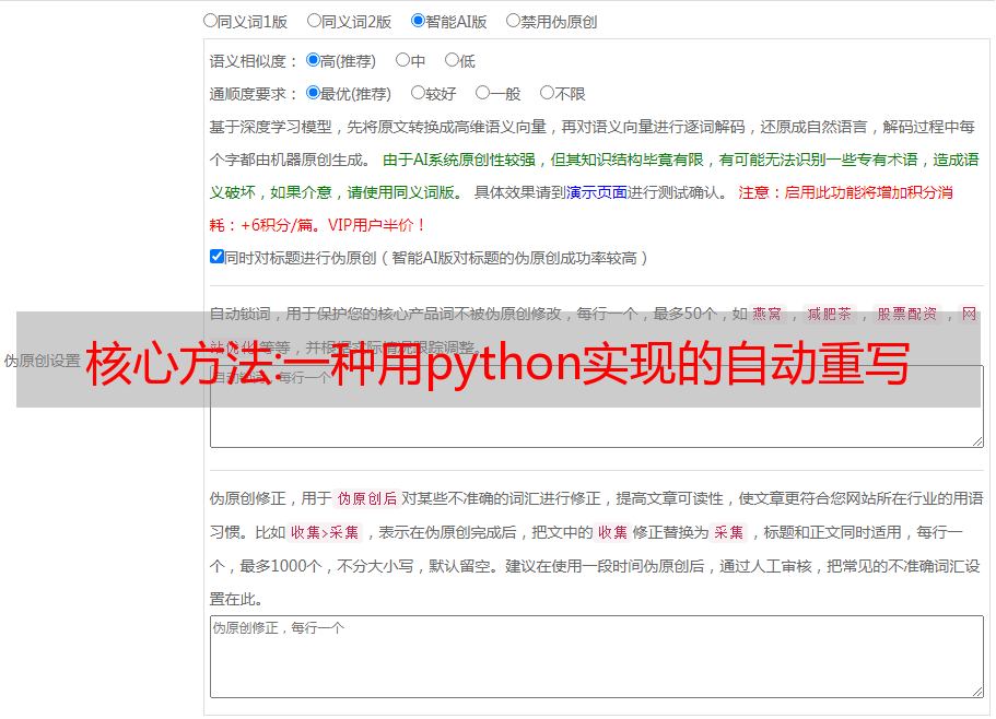2.使用工具,替换同义词,给文章加点词。 这种方法也被大家广泛使用。 如果不是很火,伪原创文章伪原创文章的。 但是现在大家都用同一套软件,文章过去被大量人转载伪原创,导致伪原创文章也很相似。 这也是不包括搜索引擎的原因。 如果只是因为一篇文章不是很火,关于这篇文章的伪原创文章不多,那么这样的伪原创文章还是不错的。 但是现在大家都用同一套软件,文章被很多人转载就是伪原创。 结果就是出现了很多雷同的伪原创文章。 3、开头和结尾手动写,中间的文章用第二种伪原创的方法,然后合并成一篇。 这种方法还是比较有效的,但是对于网站来说也比较费时。 那么看看网站们是如何权衡的。 优缺点比较突出。 4. 首先,用这个软件检查你的伪原创文章和网络文章的相似度。 一般相似度应控制在50%以下。 5、伪原创文章控制好可读性,吸引很多人点击阅读,但跳出率很高,停留时间很短。 搜索引擎也可以直接判断网站内容的可读性很差。 6.提高网站权重。 当网站权重高时,如果你转载一篇文章,它会比那些权重低的网站先被收录。 这句话不是这个身份高的人说的,但我还是选择相信身份高的人。 同样的原理权重高,文章会早点收录。
