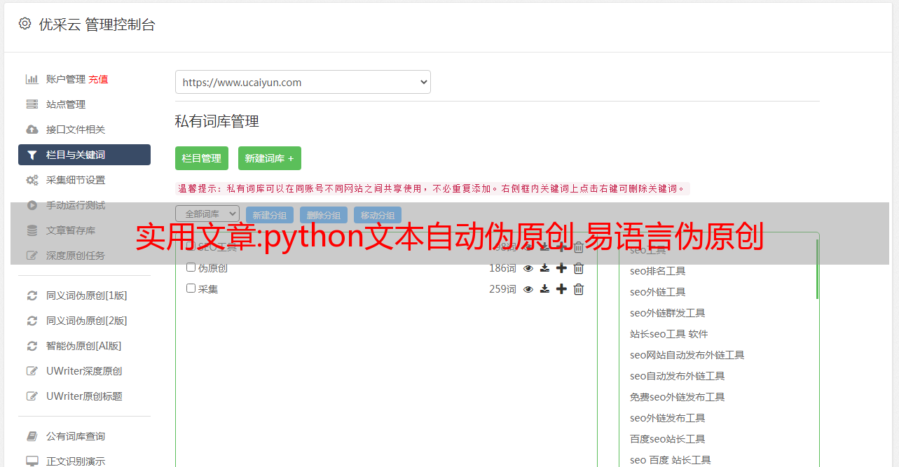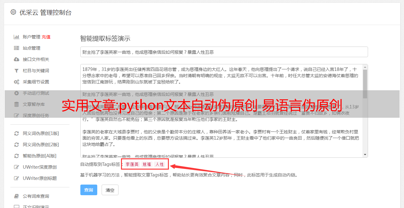 _ 爬取目标网站的页面内容(爬虫程序); __ 导入伪原创工具API,批量伪原创内容; __ 数据存储和网站自动化数据发布; _
