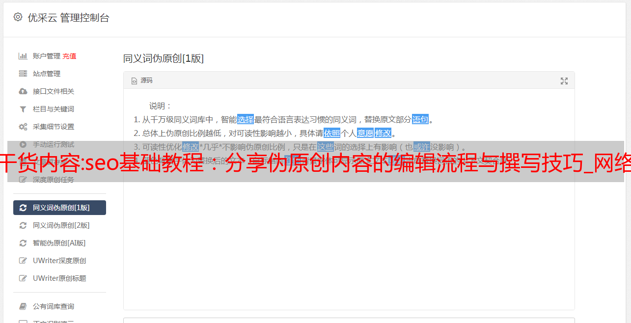 优采云 发布时间: 2022-12-26 06:46干货内容:seo基础教程:分享伪原创内容的编辑流程与撰写技巧_网络营销 ...