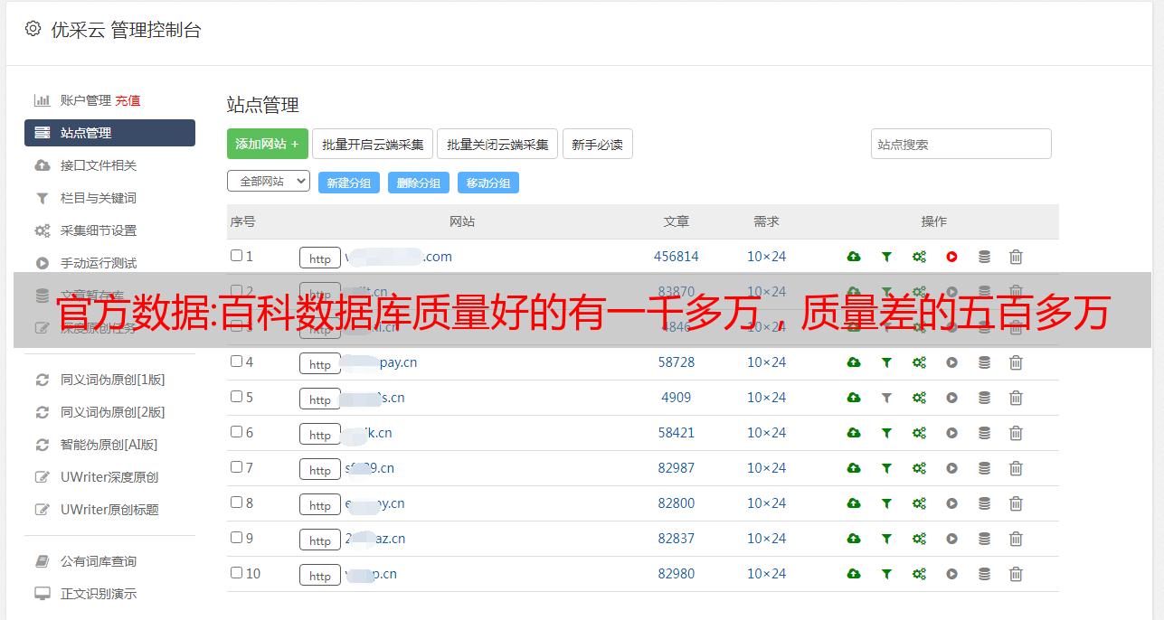 优采云 发布时间: 2022-12-26 13:12官方数据:百科数据库质量好的有一千多万,质量差的五百多万