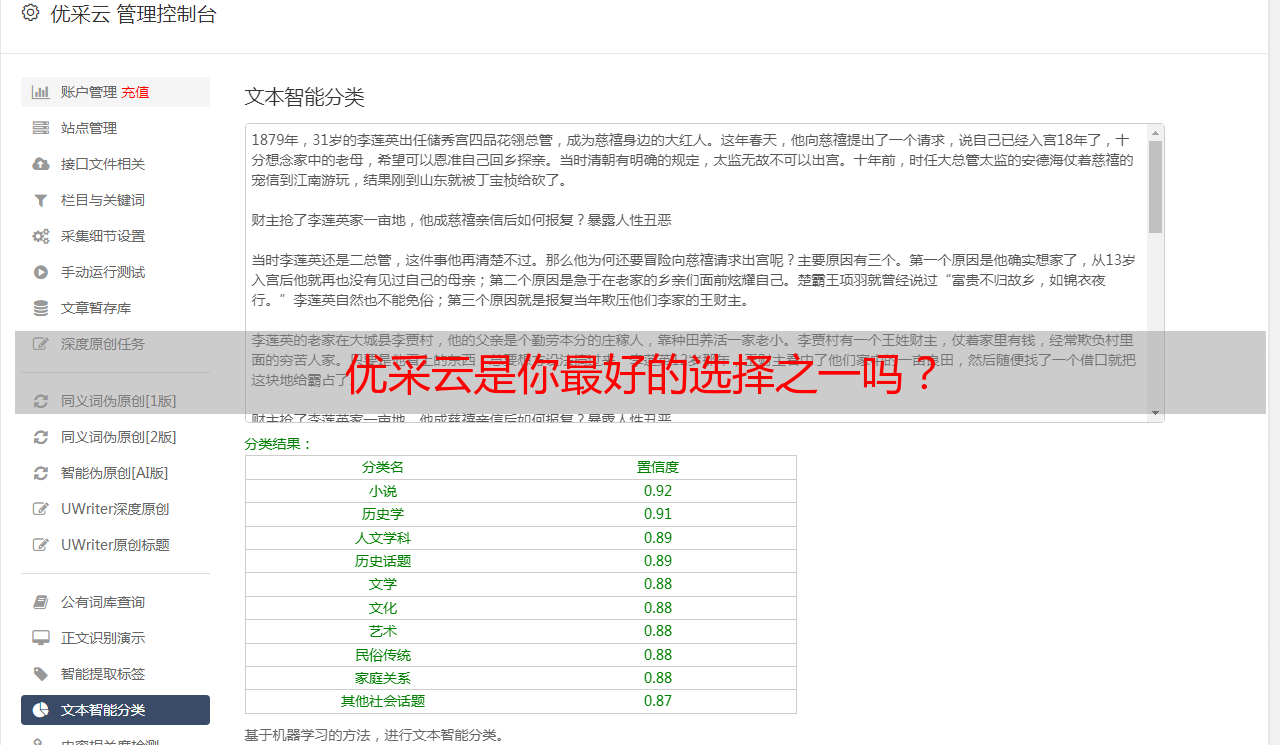 总之,优采云是一个功能强大、效率高、易于使用的文本生成软件,可以帮助用户快速、高效地实现写作目标。如果你正在寻找一个能够帮助你实现你想要目标的强大工具,不妨来试试优采云吧!它将是你最好的选择之一。如果你想要了解更多关于优采云的信息,可以前往它的官方网站www.ucaiyun.com进行浏览。