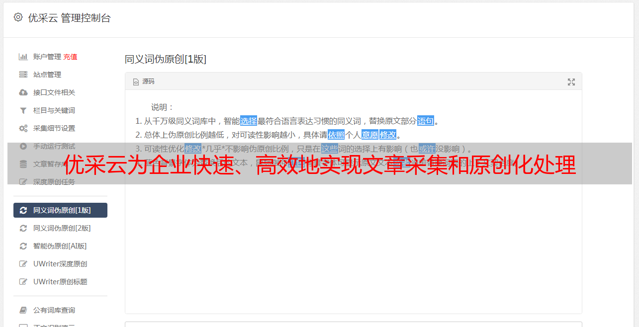 优采云为企业快速、高效地实现文章采集和原创化处理