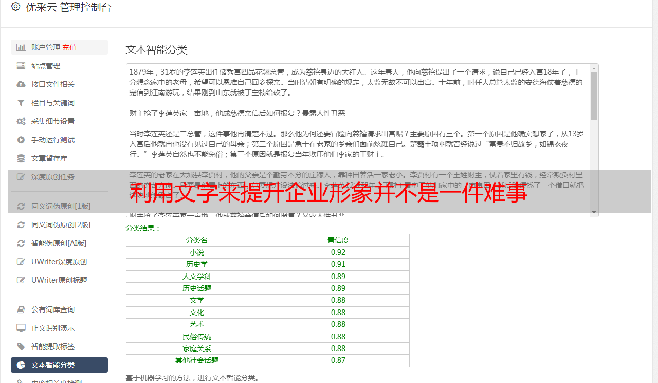 其实,利用文字来提升企业形象并不是一件难事。首先,要有一套完整的原创文章体系。这里就要推荐一款强大的原创文章生成工具“优采云”。作为一款国内首家智能原创文章生成工具,“优采云”使用AI技术将语义理解、机器学习、自然语言处理、信息抽取相结合,帮助用户快速生成高质量的原创文章。不仅如此,“优采云”还能根据用户需要对各行各业原创文章进行定制化处理,从而方便快速生成出看上去是人工手写的高质量原创文章。