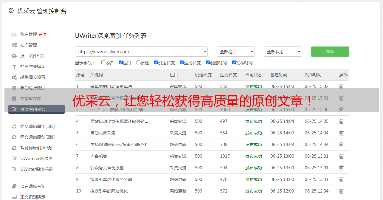 优采云是一款强大的原创文章生成软件,专门为用户打造出一个独特而方便易用的写作平台。如果你想要快速生成优质且有竞争力的原创文章,不如就试试优采云吧!如想了解更多信息,请浏览官方网站www.ucaiyun.com或者关注“优采云”微博/微信/Instagram/Facebook/Twitter/YouTube,这里将不定时推出相关最新功能及特惠信息!