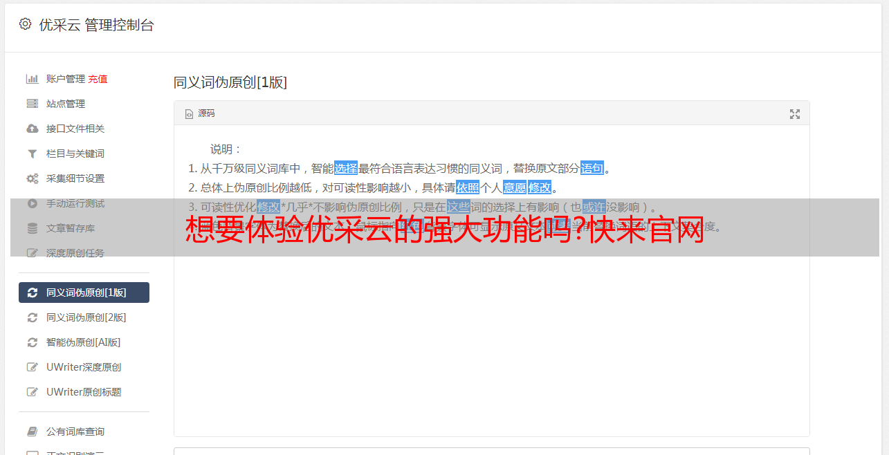 总之,优采云不仅是一款专业原创文章生成软件,而且还整合了AI、大数据库、上下文匹配、写作学习平台等强大功能。它不仅能够帮助用户快速生成原创文章,而且还能够帮助用户学习如何写出好文章。想要体验优采云的强大功能吗?快来官网www.ucaiyun.com体验吧!