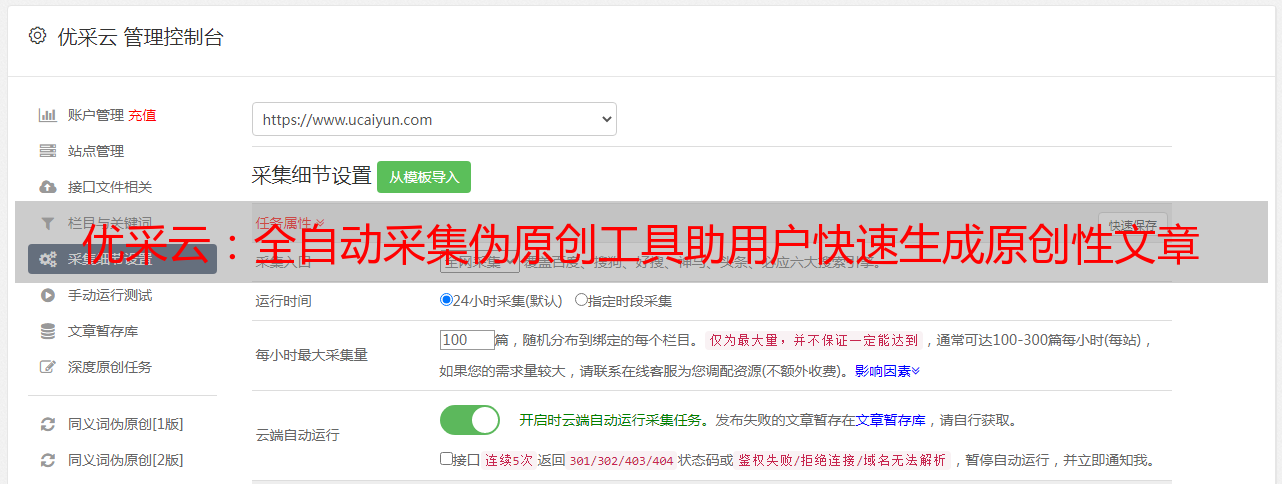 总之,优采云是一款强大易用的全自动采集伪原创工具,可以有效地帮助用户快速生成一份看上去像是由人工手动创作的原创性文章。如果你正在寻找一款高效便捷、功能实用的新闻生成工具来帮助你快速生成原创性文章,那么就不要错过了优采云——www.ucaiyun.com!