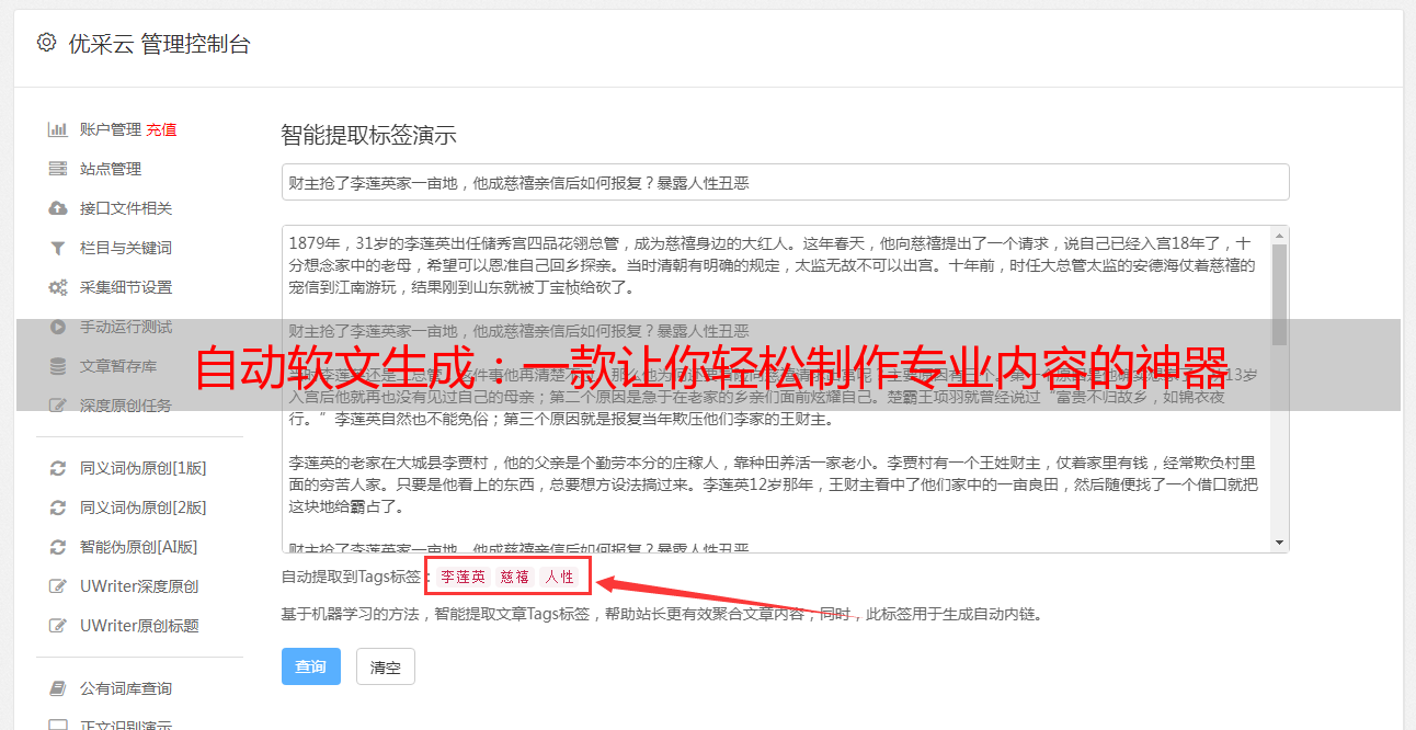 优采云是一款易用的自动软文生成工具,能够帮助企业轻松制作出专业的内容。优采云既可以帮助企业通过文章、图片、视频等方式制作出高效、吸引人、有价值的内容,又能够帮助企业根据关键词快速找到相关新闻和信息,使企业能够快速应对新闻热点。