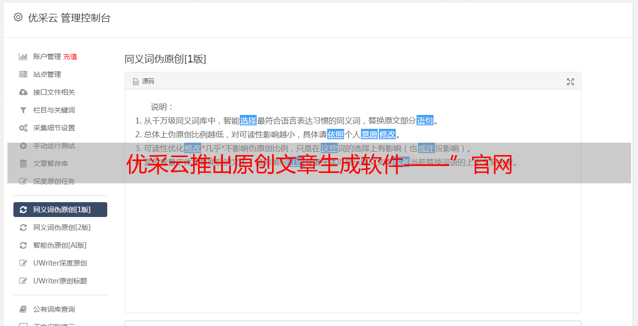 优采云是一款集机器学习、AI人工智能与语料库于一体的原创文章生成软件,通过对大量海量数据进行深度学习,并结合AI人工智能实时收录随时更新语料库信息,可根据用户需要快速生成多种不同主题、不同内容样式、不同风格、不同口味的原创文章。而且,优采云还能够根据用户特定需要进行定制化设置,从而可以快速生成内容权威、语法正确、平易近人的高质量原创文章。