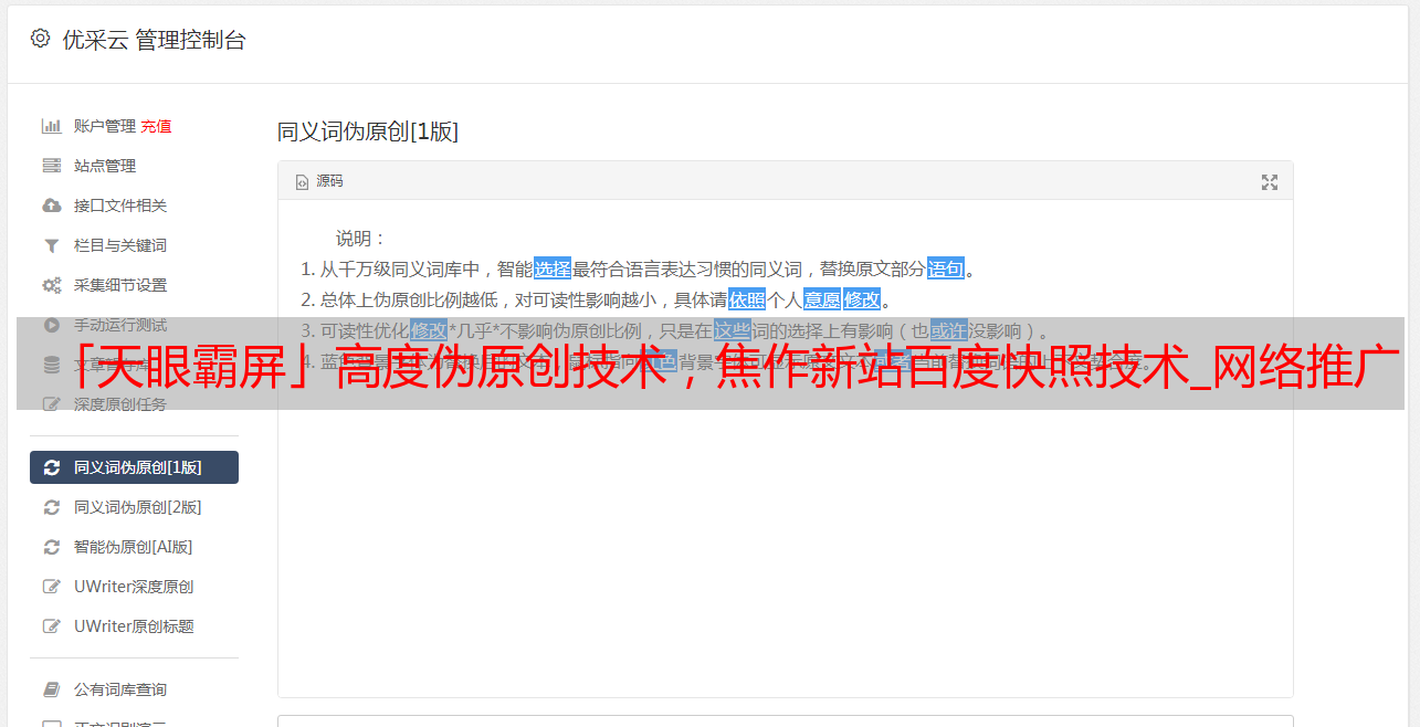 优采云 发布时间: 2021-06-01 05:01「天眼霸屏」高度伪原创技术,焦作新站百度快照技术_网络推广