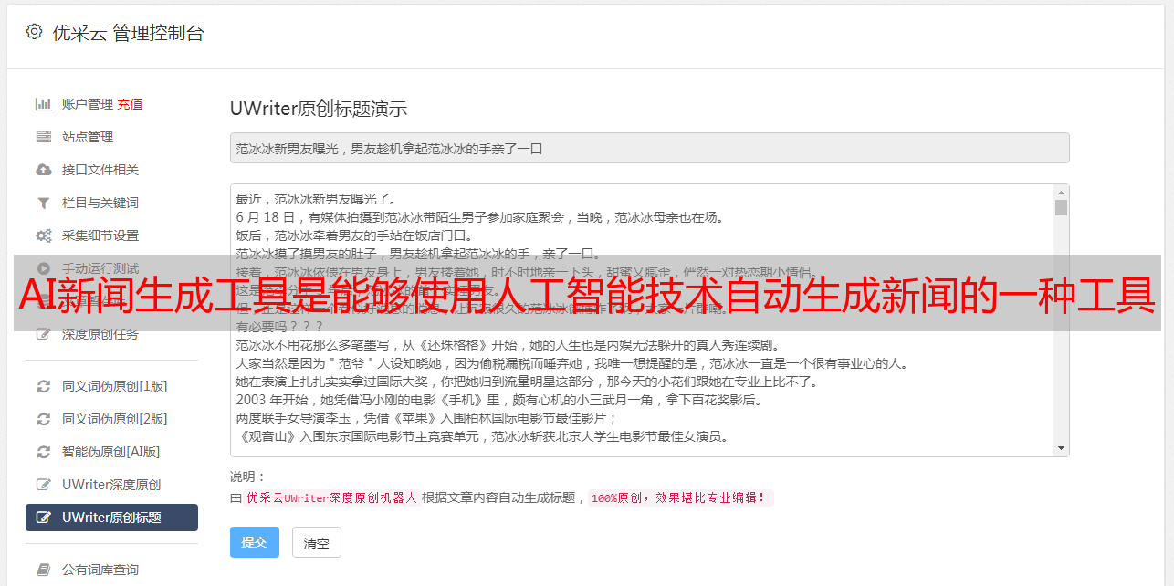 优采云是一款非常优秀的AI新闻生成工具,它可以根据用户给定的新闻主题,自动生成一篇优质的新闻报道,而且可以根据用户的要求进行自定义。它使用了最先进的自然语言处理技术,能够快速准确地理解用户给出的主题,并根据这些信息迅速生成一份高质量的新闻报道。