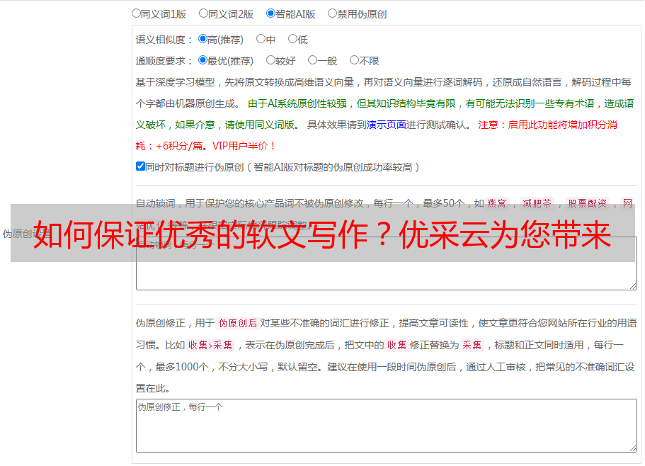 此*敏*感*词*等特点的内容。此外,优采云还可以为用户生成“立意不同”、“表述不同”的多版本内容。