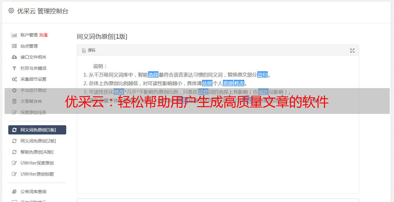 此时,优采云就可以帮助大家解决这一问题。优采云是一款能够轻松帮助用户生成高质量文章的软件。其技术基于AI技术,通过语义分析和相关度匹配分析,能够帮助用户生成出各种主题的文章。