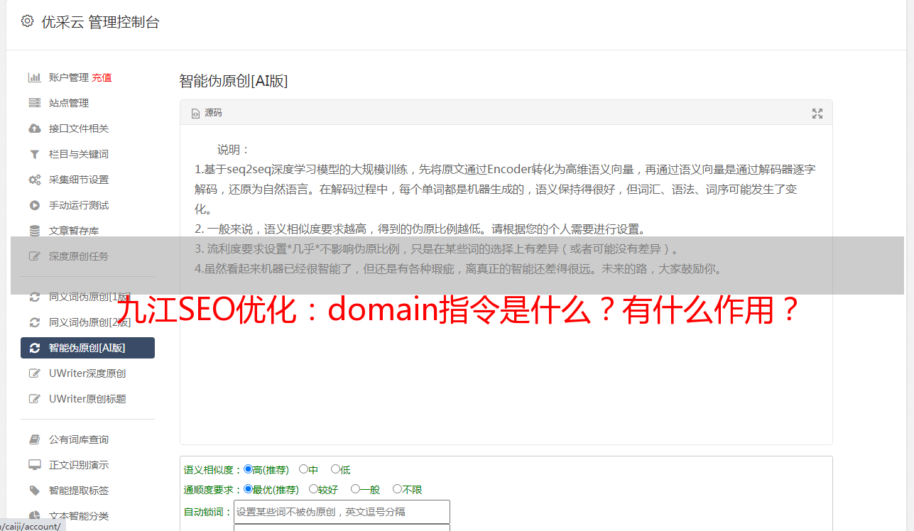 对于SEO来说,SEO优化中用到的指令很多,使用最多的无非就是站点指令和域名指令。 site命令用于查询收录的数量,domain命令用于查询反链数。接下来九江SEO优化就为大家介绍一下什么是域命令,它的作用是什么。有兴趣的可以看看。