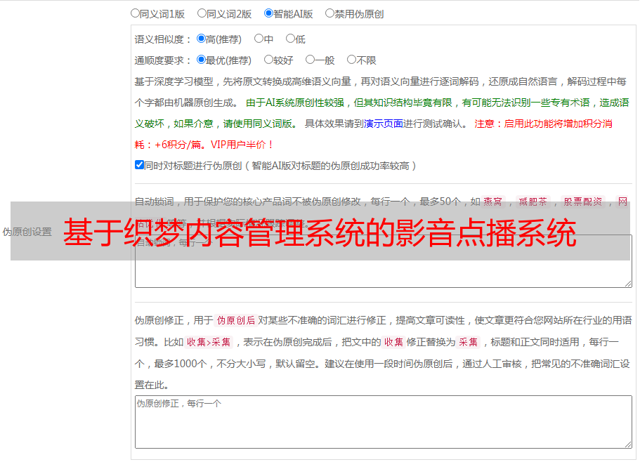 而许多网站管理系统在新闻发布上太强, 而在网站的多样化管理这方面的特 性却不是非常突出,一个丰富的网站在发展时恰恰须要更多样化的方向和管理, 基于此,dedecms 诞生了,它的设计真谛就是要给用户一个自由的管理空间,利 用成熟的 WEB 技术和应用管理理念,让用户真正体验自由驾驭网站的乐趣.2 基于织梦内容管理系统的影音点播系统2.1 基于织梦内容管理系统的影音点播系统概念 视频点播是计算机技术、网络通信技术、多媒体技术、电视技术和数字压缩 技术等多学科、多领域融合交叉的产物,从根本上改变了传统的双向传输、用户 对视频节目无权选择的状况, 使用户可以自由选择储存在视频点播系统中的视频 信号,随时点播自己想看的节目。基于织梦内容管理系统的影音点播系统就是视 频点播系统与织梦内容管理系统相结合的产物。 2.2 基于织梦内容管理系统的影音点播系统特性 使用织梦内容管理系统管理的影音点播系统将管理人员从繁杂的手工管理 中解脱下来,快速便捷地管理大量的视频,通过动态内容静态化,最大幅度的降 低了系统的负荷。 2.3 影音点播系统需求剖析 2.3.1 系统须要解决的问题 影音点播系统主要面向用户通过网路观看欣赏影片等影音文件, 因为硬件方 面的要求,不可能支持无限人数观看,所以设计注册成为会员,对会员进行合理 管理来观看影视。