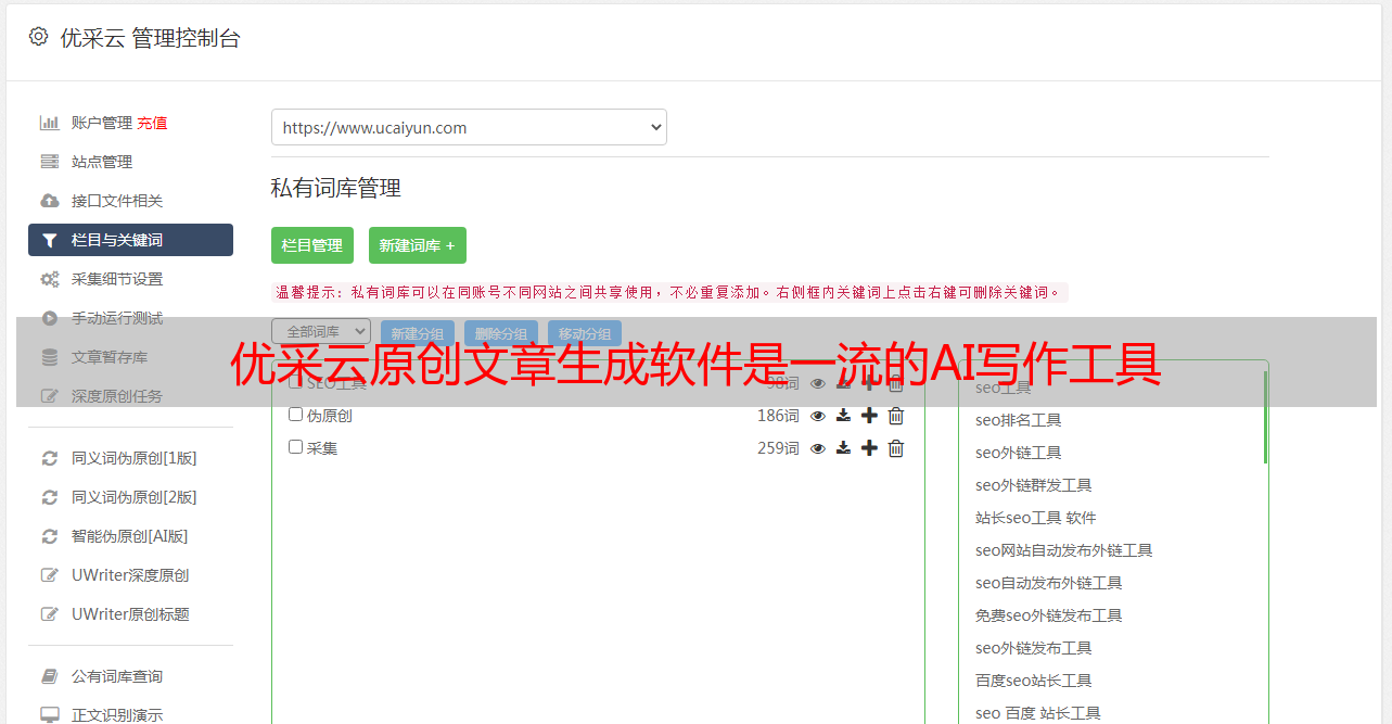 使用优采云软件,所有人都可以在几分钟内实现原创性写作–无需多少时间、努力或写作技巧.这个强大的AI写作平台包含各种功能,如“文本转语音”、“图片/声音/文本上传”、“语义分析”、“核心词表”等,帮助用户快速生成优秀的原创文章内容。而且,由于使用了云平台,因此所有数据都可以实时保存在安全的云空间中。