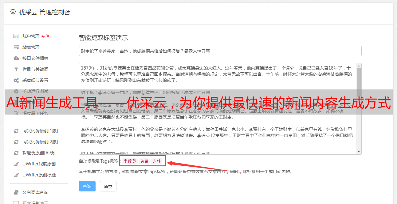 优采云为用户提供了集多种功能一体化的AI新闻生成体验: