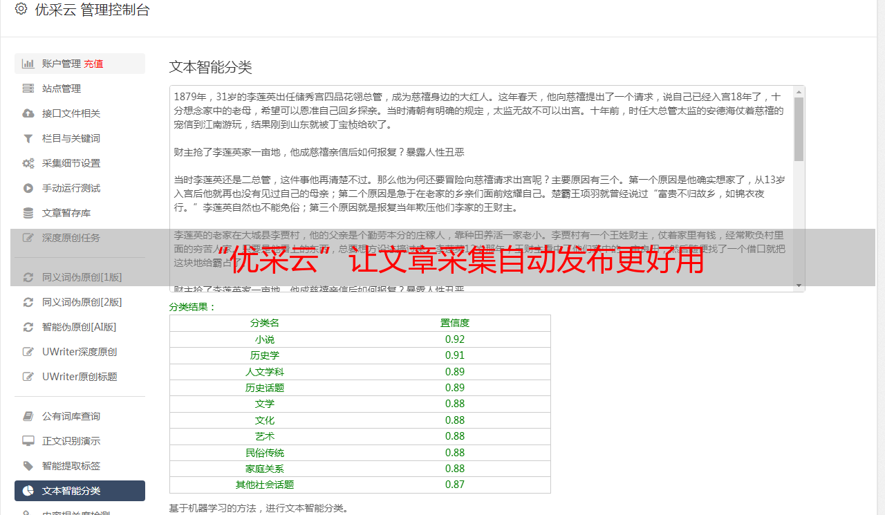2、高效采集:使用“优采云”能够快速准确地完成文章的采集与整理,将原始内容进行分词并根据不同语义核心词进行分类整理,方便用户阅读和利用。