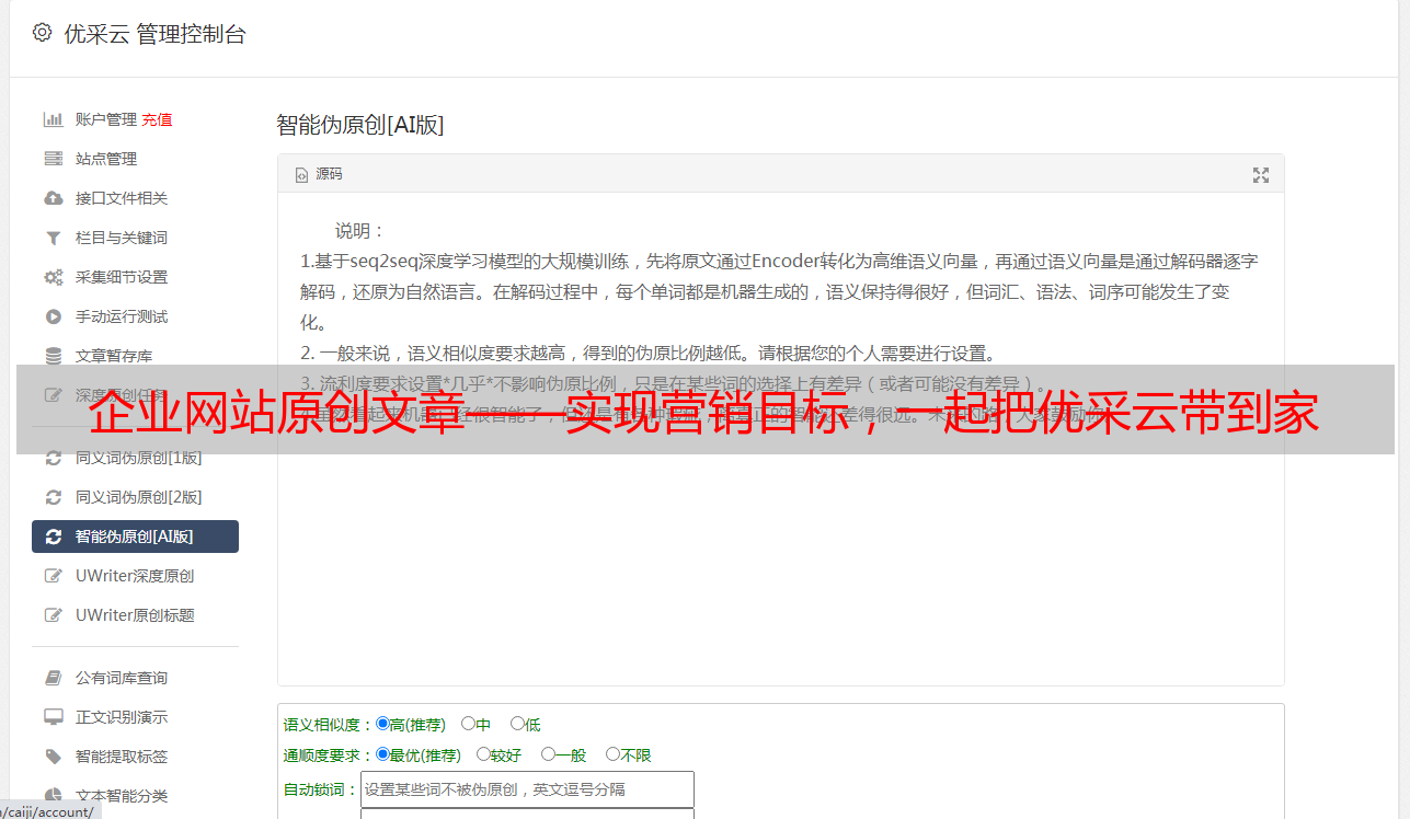 就如何使用原创文章来实现营销目标而言,使用一款能够充分发挥原创文章功能的营销工具是必不可少的。这里推荐大家使用优采云营销工具。优采云是一款集合内容创作、内容传播、内容分析和内容运营功能为一体的营销工具。通过这一工具,我们可以快速把原创文章带到各大平台,并控制文章呈现形式,增强用户体验感受。此外,优采云也能够包装不同产品内容为一体化体验,令读者看得清晰明了、看得想买。
