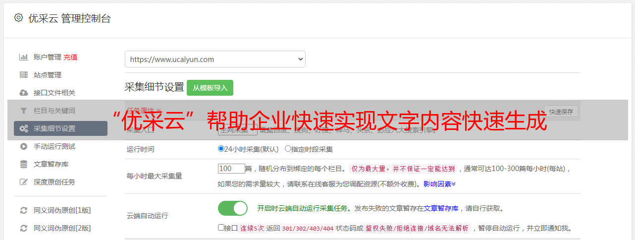 “优采云”是一款能够帮助企业快速实现网络营销推广的全自动化软件。它能够帮助企业实现文字内容的快速生成,并提供详尽的文字加工流程,从而让企业可以迅速将原始内容变成更加具备引导性、链接性、影响性的文字内容,这样就能够在一定时段内大量地增加用户对该企业的关注度、使用率,从而大大提升了该企业的市场竞争力。