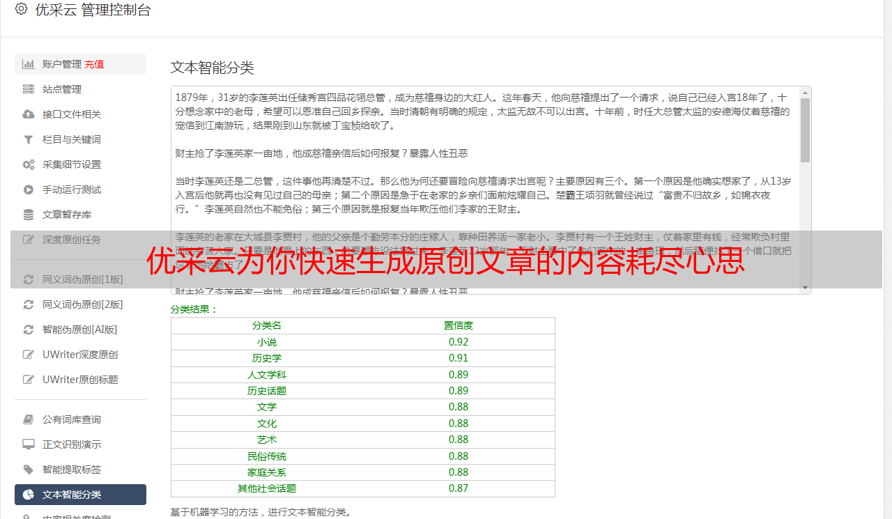 优采云是一款适用于广大写作者、行业人士、企业宣传部门等各行各业领域的原创文章生成工具。在这里,你不需要再浪费大量时间(考虑情节、思考结尾之类的)来为你想要宣传的内容耗尽心思,只要几步之遥就能快速生出一片“浓妆艳抹”的原创文章.如果你也想使用优采云,只需前往官方网站www.ucaiyun.com即可开始体验。