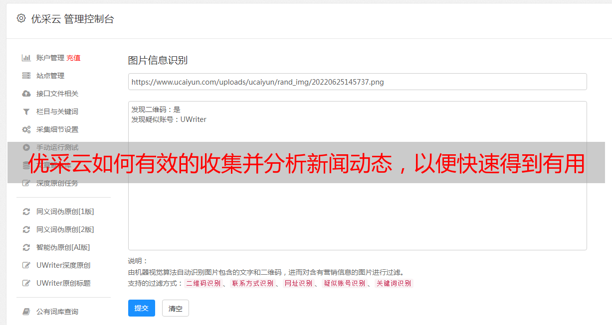 使用者只要将想要相关内容信息存储在优采云中就可以快速找出所需要内容.考虑到不同行业需要不同形式新闻动态内容,所以优采云也引入有助于区别不同行业需求内容的核心引导:当相关内容出现时,由AI进行准确化判断,快速判断分析,把有用的动态信息进行判断(权限)判别,有助于精确预判这一资讯动态的精确及时性.