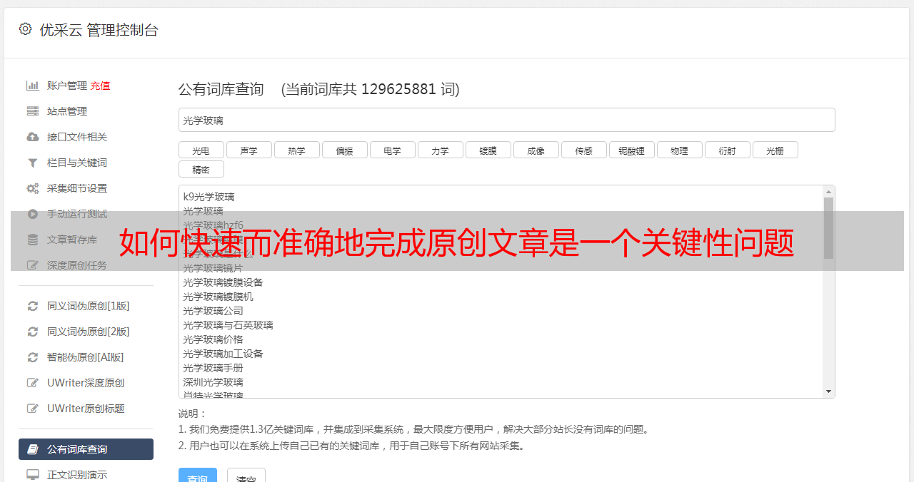 优采云是一款专业的在线原创文章生成工具,它集合了大数据、人工智能和NLP三大核心技术,将前沿大数据和人工智能应用于原创文章生成中,使得用户能够得到准确快速而有效的原创文章生成体验。
