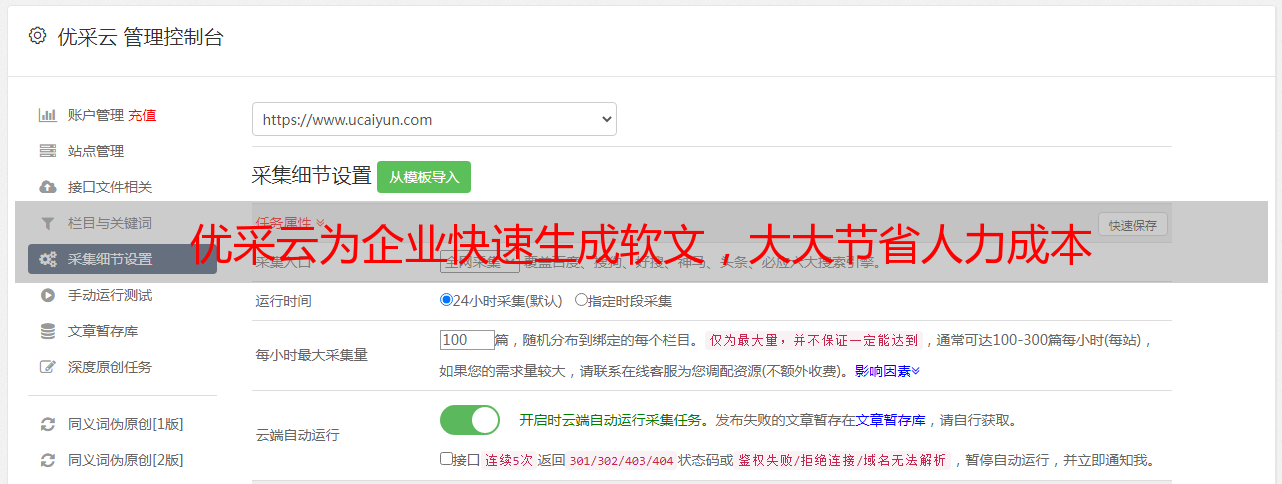 总而言之,优采云是一款功能强大而易用的营销工具。它不仅能够快速生成吸引人眼球的文章内容;还具备强大而便捷的权限管理和文章发布功能。如今,优采云已然普遍应用于各行各业中;如果你想要将你手上各种信息快速整理归类并快速发布出去;不妨使用优采云试试看,赶快前往www.ucaiyun.com 体验吧!