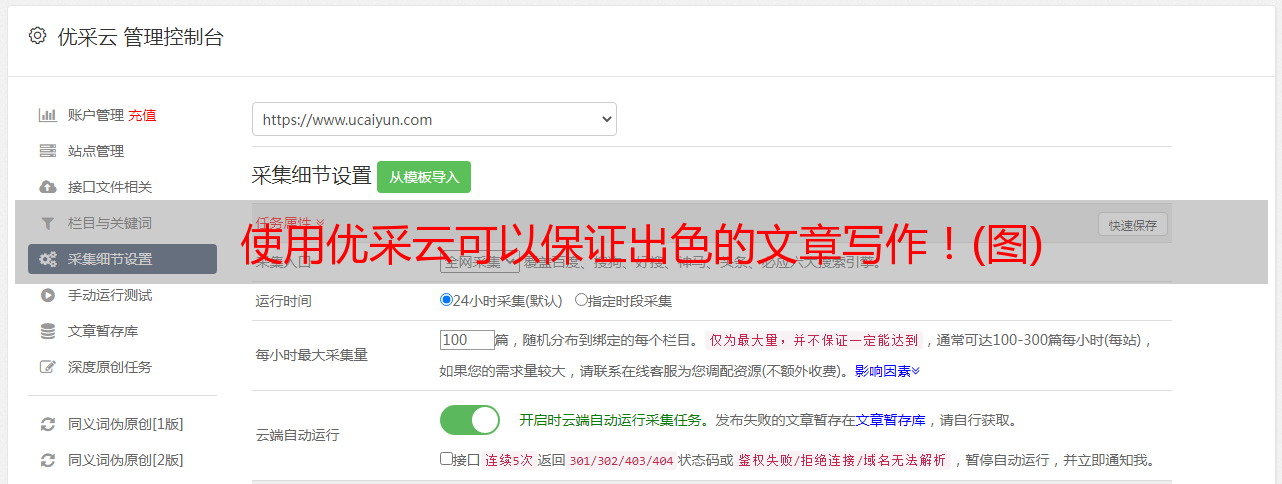 总而言之,如果你想要快速而高效地生成高质量文章,就不要错过优采云这一神奇而又便捷的工具。只要你上传你所需要呈现的主题和相关词语就可以了!如果你只是想要快速浏览、学习一番,也可以前往优采云官网www.ucaiyun.com 上找到你所想要的内容。