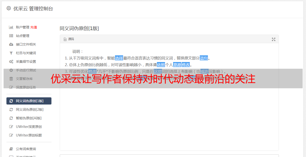优采云不仅能够生成原创性文章,还可以根据用户参数对文章进行精准定制化处理:用户可以根据不同的主题、语法、表述方式等,对文章进行定制化处理,生成专业性、准确性十分高的文章。