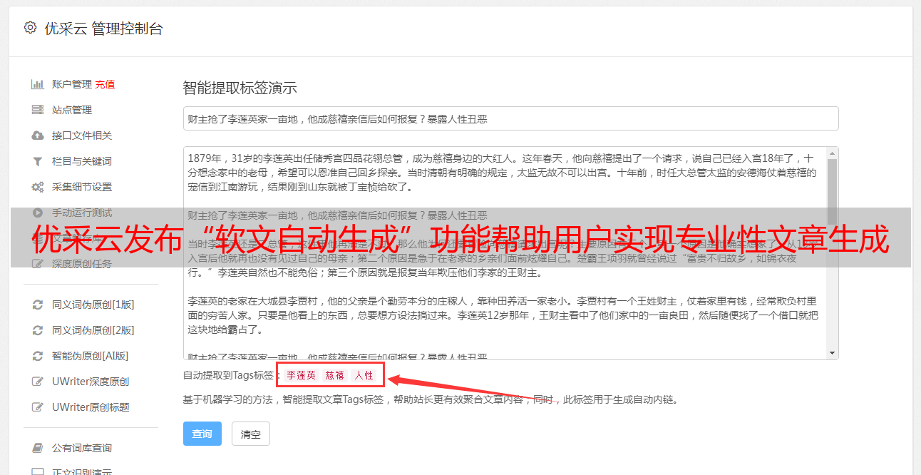 优采云发布“软文自动生成”功能帮助用户实现专业性文章生成