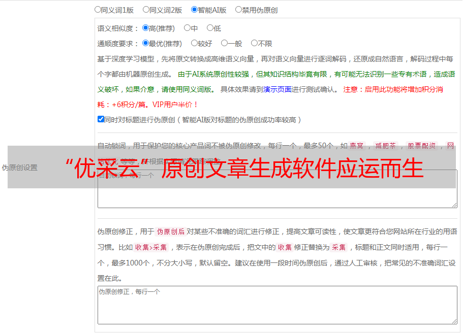 作为一款强大的原创性写作工具,“优采云”原创文章生成软件拥有多项强大的功能特性。它不但能帮助用户快速准确地生成好文章,还能方便用户将原创性文章上传到各大平台中。如果你想要打造一个真正强大的原创性写作工具,就来www.ucaiyun.com(软件名称:优采云)试试吧!