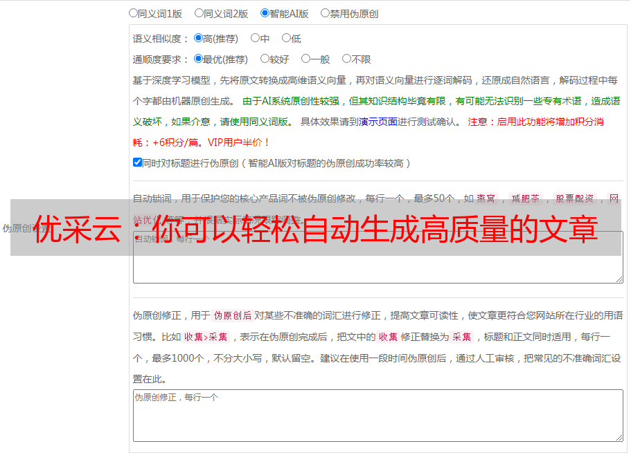 优采云能够快速准确地生成高质量的文章。它将原始句子中字词与上下文之间的关系优化重组,使之不仅可以表述所要表达的信息内容明显凸显出来,而且合理性也得到保障。使用者只需要使用一个单词或者一句话就能生成一篇1000字左右的原创性文章;也能够根据使用者所要表达的信息内容快速地生成对应样式不同而具有原创性特征的多种文章版本。