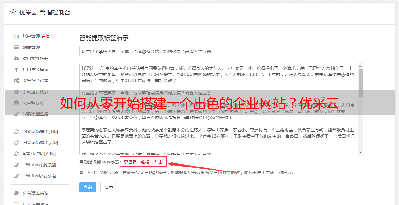 优采云 发布时间: 2022-12-30 22:23近年来,随着互联网的发展,网站已成为企业宣传自己、展示产品、吸引潜在客户的有效手段,如何从零开始搭建一个优秀的网站就成了当前许多企业都在思考的问题。对于想要搭建一个优雅、实用、易用的企业网站,其中又存在着不少困难,尤其是在熟悉互联网行业及相关技术上。