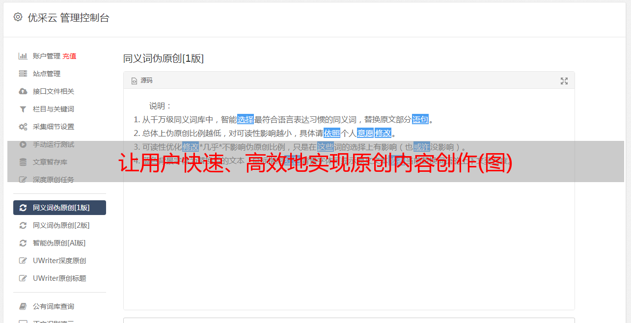 优采云的宗旨是“让用户快速、高效地实现原创内容创作”。因此,优采云拥有强大的智能算法,可以根据用户输入的关键词,快速生成原创性文章。此外,优采云还可以根据用户需要,将多条关键词融合在一起,生成多次信息合并的原创文章。此外,优采云还能够借助AI功能,快速生成流行话题相关的新闻内容。