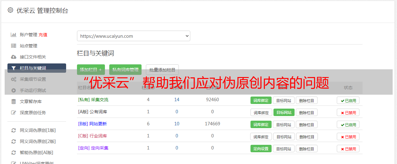 “优采云”是一款集采集、处理、发布、维护于一体的全自动采集伪原创技术,主要针对新闻内容、行业资讯、网络图片等内容进行处理,帮助用户快速生成高质量可读性文章,并便捷地将其推广到各大新闻媒体上。