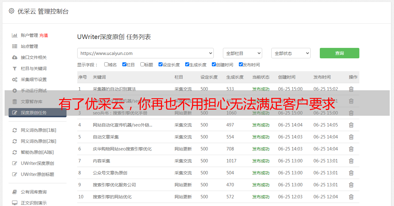 有了优采云,你再也不用担心无法满足客户的要求了。优采云是一款能够快速生成高质量文章的软件,可以帮助您在有限的时间内创造出有创意、准确无误、干净整洁的文字内容。它由AI(人工智能)强大后台驱动,能够根据用户所提供的关键词、文章内容和要求自动生成文章。