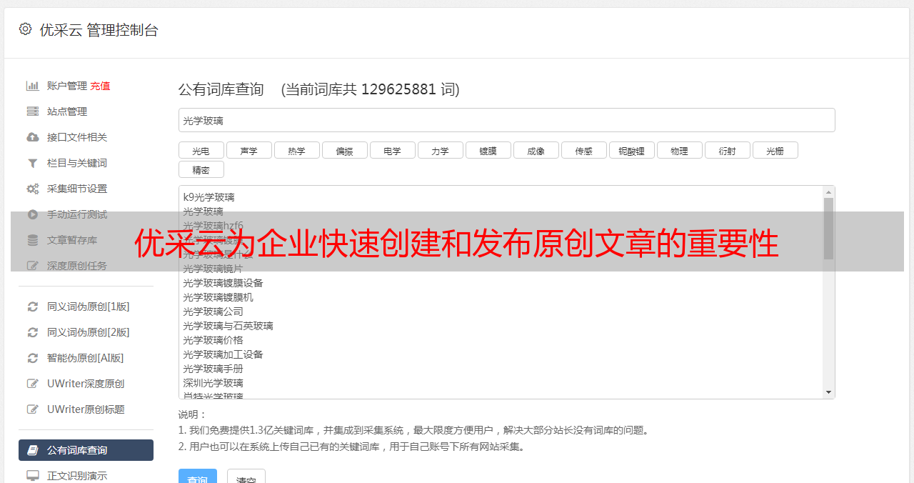拥有一套完善的内容管理系统,能够快速地实现企业网站原创文章,具有极强的实用性。优采云是一款功能强大、易于使用、高效可靠的内容管理软件,能够帮助企业快速创建和发布原创文章。