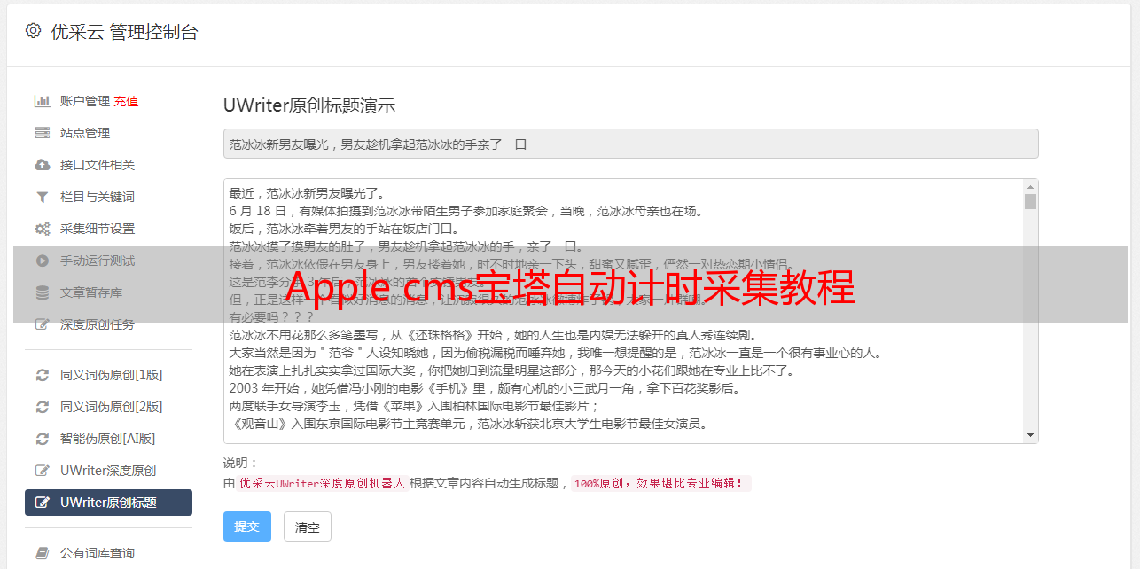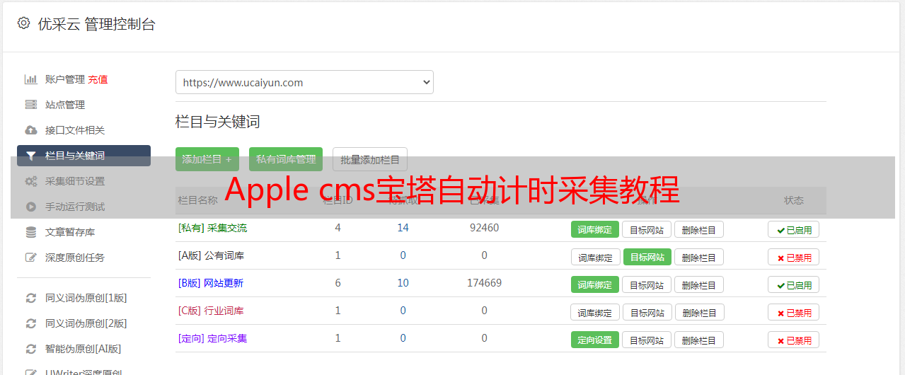 优采云 发布时间: 2020-08-07 15:13建立自己的网站并添加自定义资源库后,由于手动采集方法既费时又费力,并且更新时间不够及时,您是否特别希望将有一个自动定时采集功能网站添加视频的方法?资源可以解放您的双手,所以现在我的主题网络将分享Apple cms宝塔自动计时采集教程